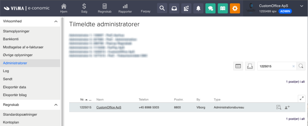 - I søgefeltet, over administratorlisten til højre, skriver du enten aftalenummeret(1225015) på din administrator eller din administrators navn(customoffice) og klikker på forstørrelsesglas ikonet "Søg".