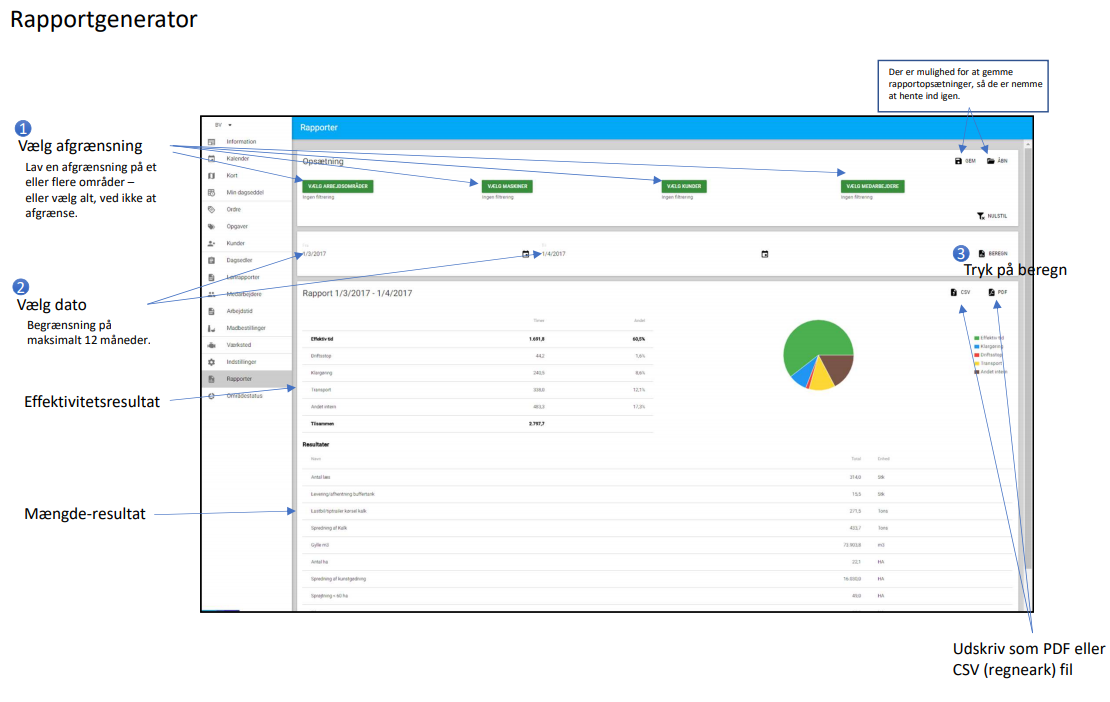 Under menupunktet [Rapporter] - kan man få et overblik over tidsforbrug og effektivitet med udvalgte data.