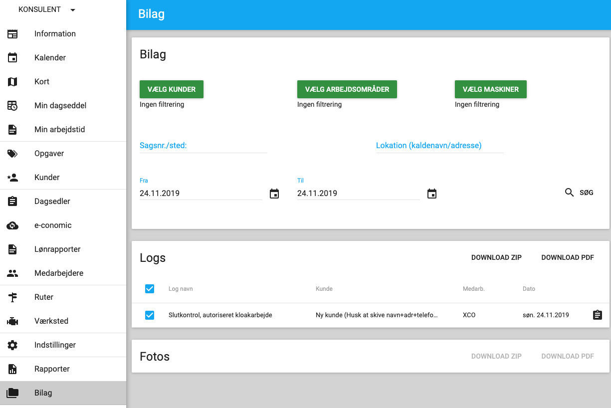 6. Kontrolskemaet er nu gemt på opgaven. Du har altid mulighed for at se den herinde igen. Desuden har du mulighed for at trække en rapport over alle de kontrolskemaer der findes under Bilag - Logs: