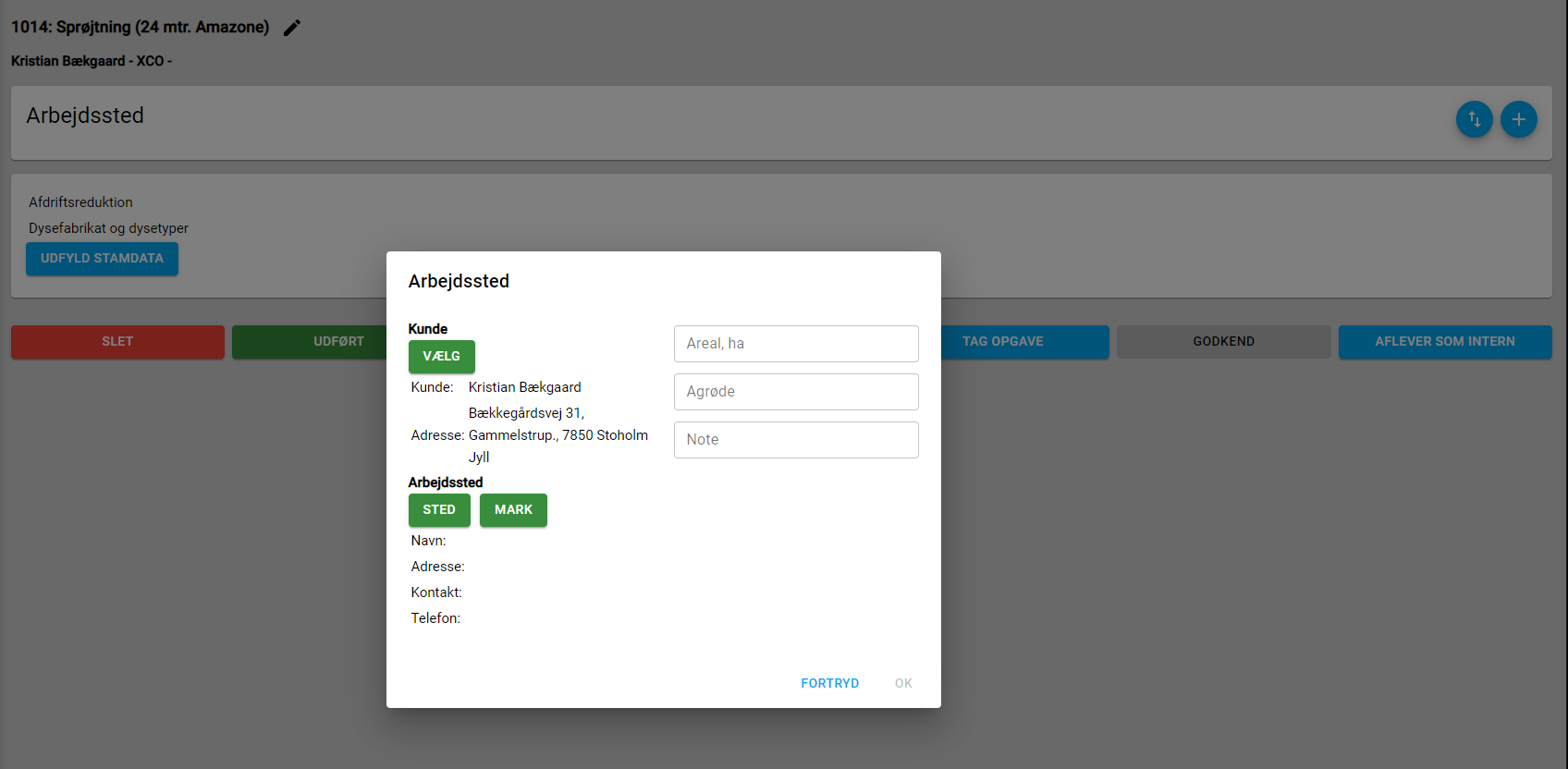 Her udfyldes informationen om det første arbejdssted, hvor der skal sprøjtes. Kunden er valgt på forhånd, da det blev gjort i oprettelsen af opgaven. Nu mangler Marken. Tryk på knappen MARK (se billede 3) for at se kundens liste af marker, og vælg den første mark. Alternativt kan informationerne udfyldes manuelt i felterne til højre, hvis marken ikke findes. Findes marken ikke, kan den oprette gennem knappen STED og trykke "Tilføj arbejdssted" (se billede 4)
