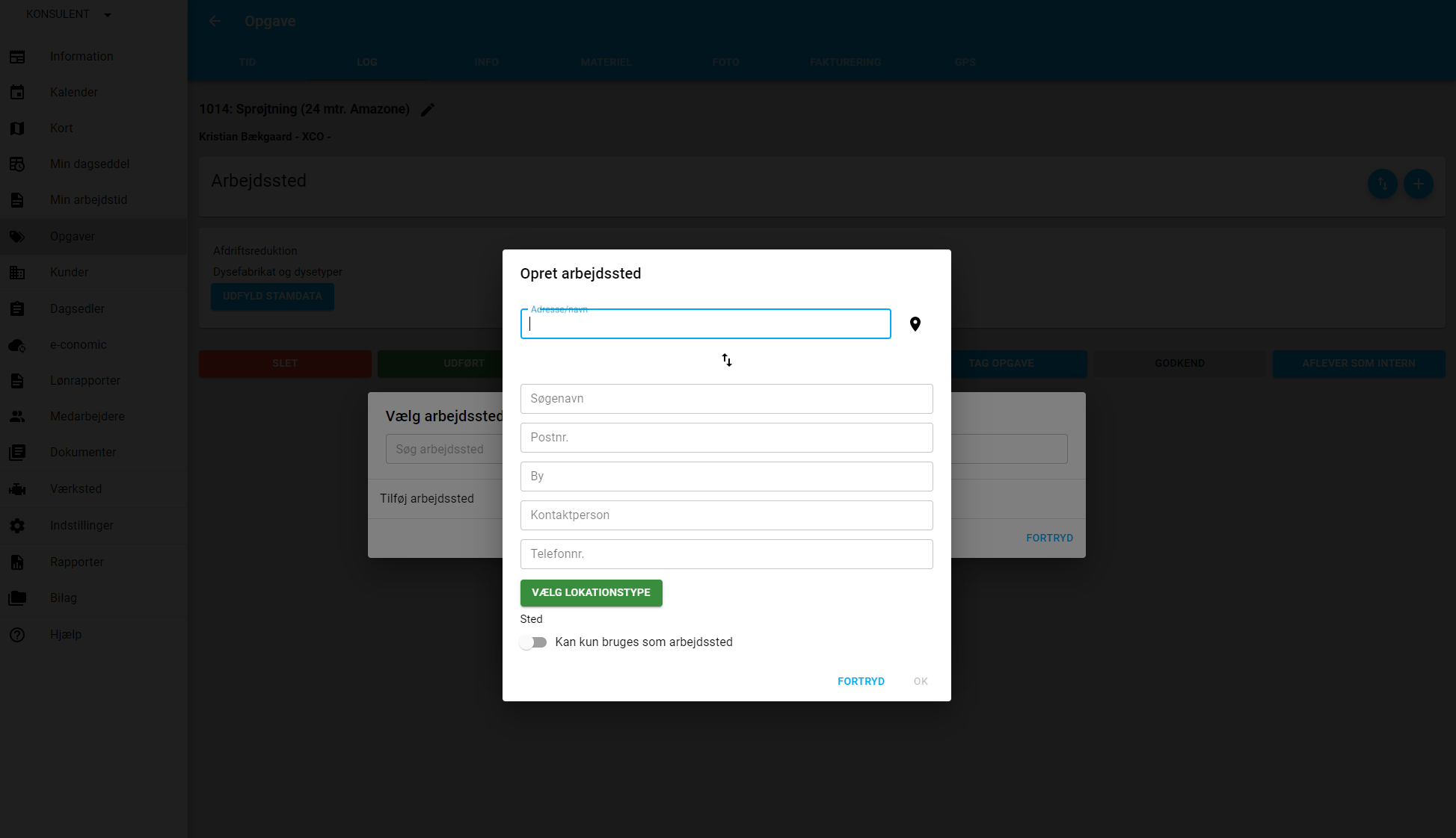 Man starter med at vælge arbejdssted, ved at trykke på den blå knap til højre med plusset.