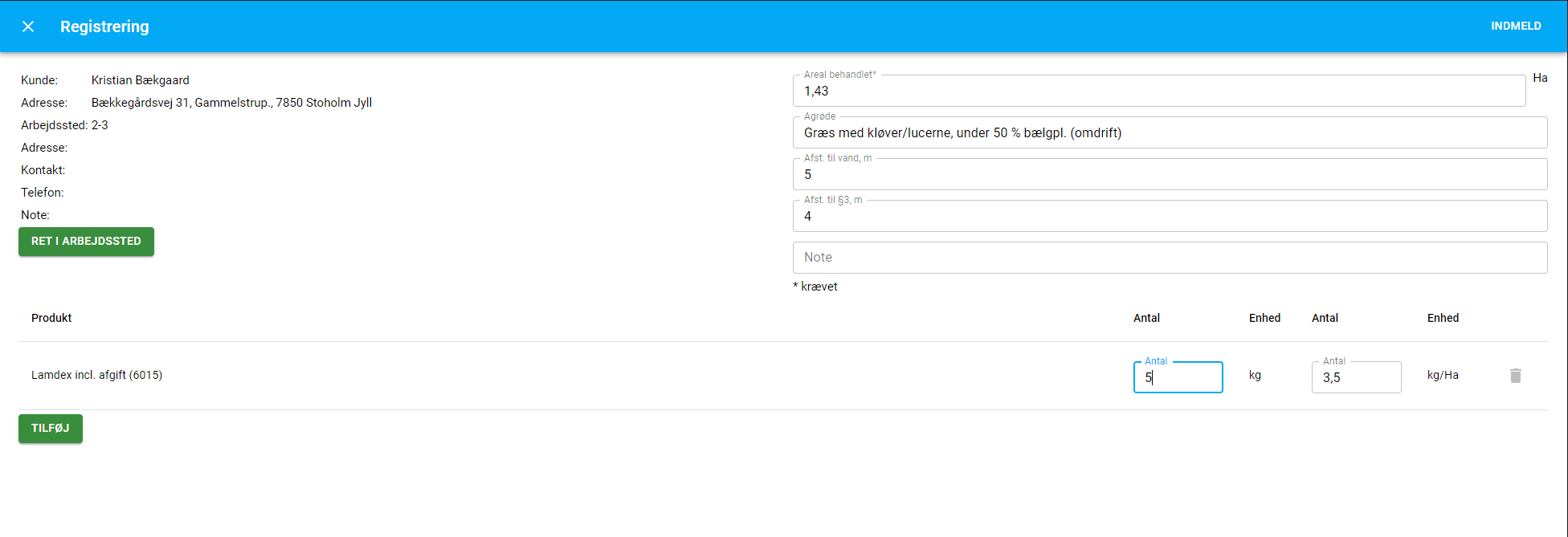 Her er det muligt at danne et overblik over hvad der er sprøjtet på den enkelte mark, da det også er her man tilføjer det materiel, som er blevet brugt. Udfyld informationen om afstand til vand, samt §3, mængden af det materiel som er brugt. Afslut med at trykke INMELD øverst til højre. (ADVARSEL! Efter der er trykket indmeld, kan der ikke rettes i det tilføjede arbejdssted.)