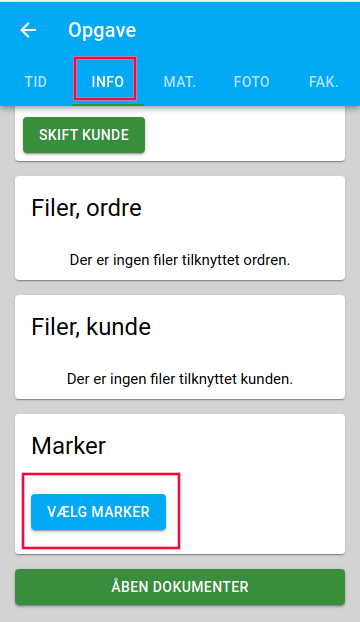 På en opgave kan man nu finde markerne for den pågældende kunde under "info" fanebladet ved at trykke på "vælg marker"